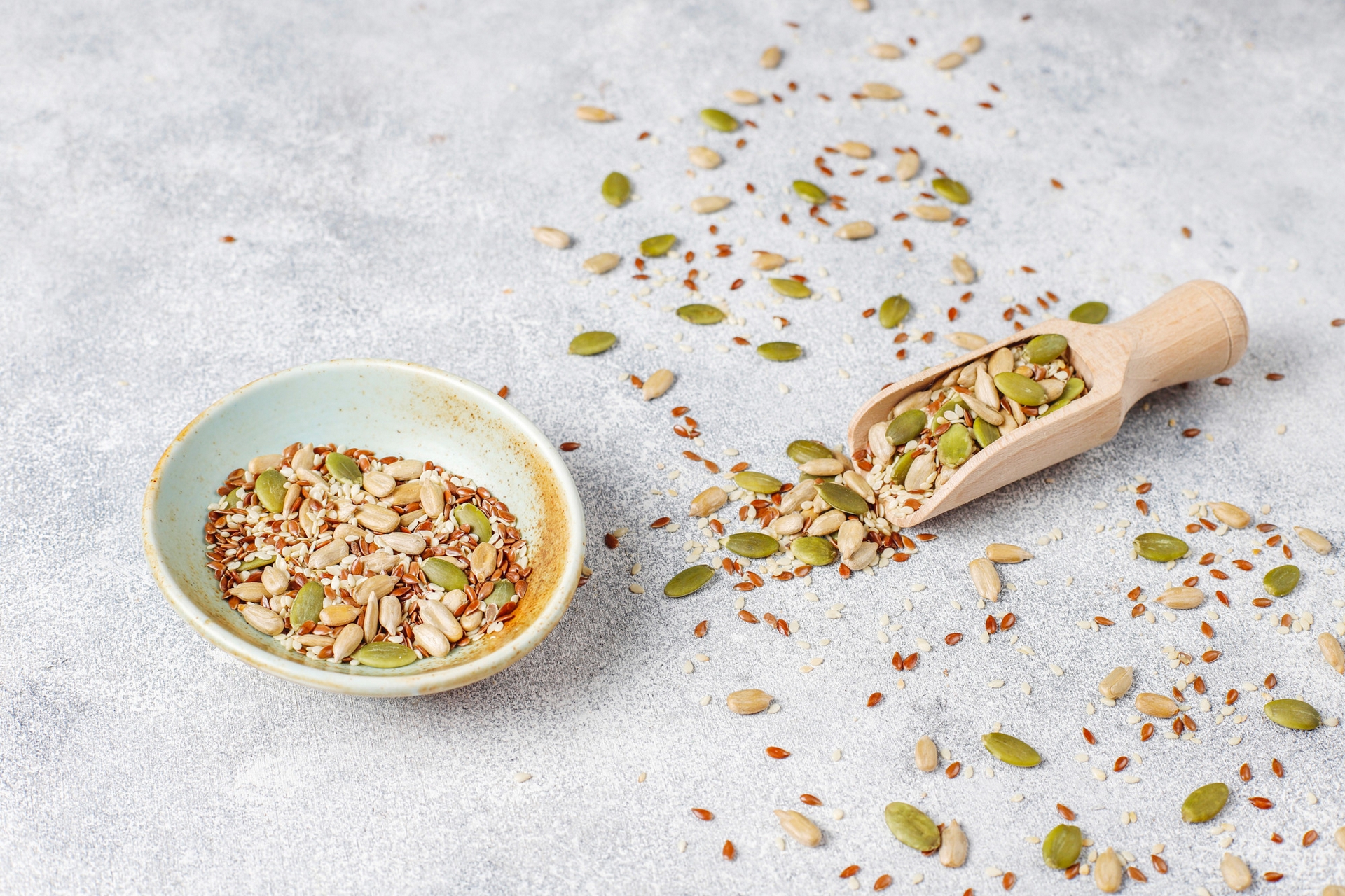 I semi di zucca sono un'eccellente fonte di zinco, associato al benessere della prostata e all'equilibrio ormonale. Semi di lino e di girasole apportano acidi grassi omega-3 che possono favorire la circolazione e la salute del cuore.